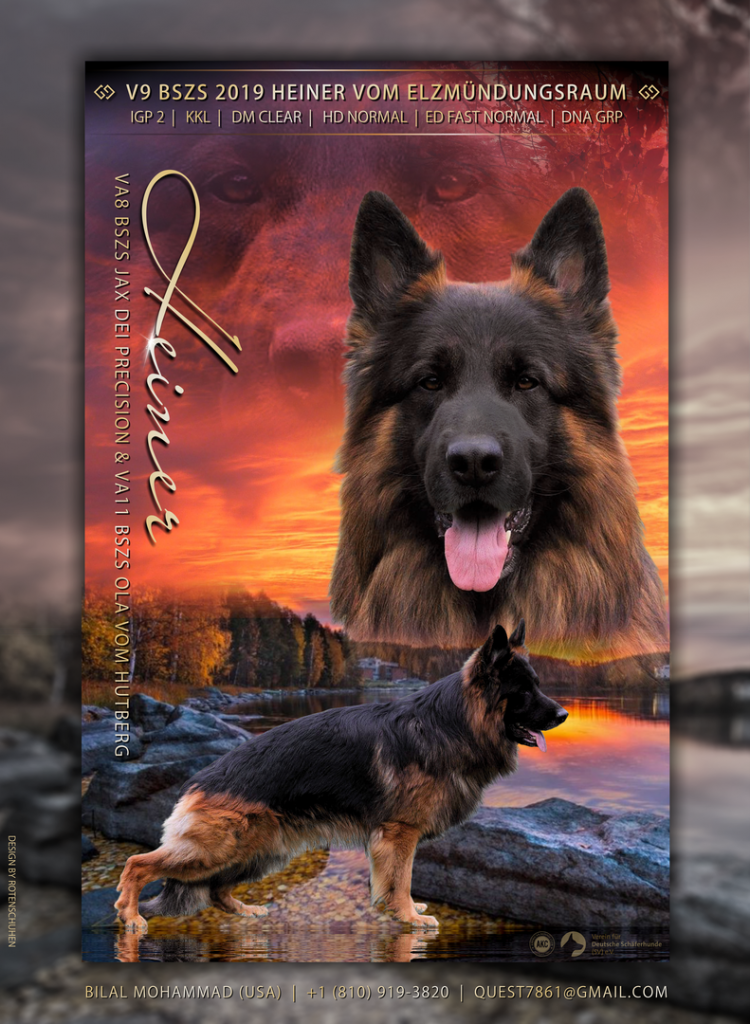 - A young dog that has already achieved world results at numerous shows. After SG4 2018, in an equally great competition in the first season in the working class, he won V9 place on the German Sieger. His excellent anatomy and character traits along with excellent health results and both parents who achieved VA results provide his offspring with a wide range of the best attributes who adorn German Shepherds.